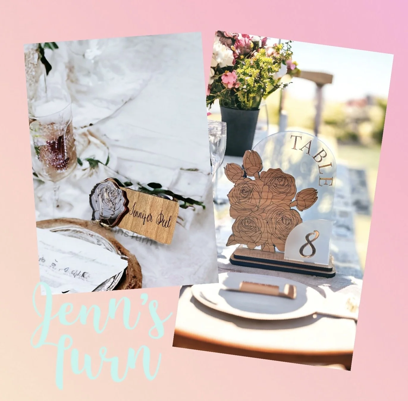 The Jenn’s Turn team will work with you to create custom decor and gifts for your event, family, friends, bridal party, etc… We offer personalized custom engraved products in various materials, including wood, acrylic, glass, leather, water bottles, and flasks.